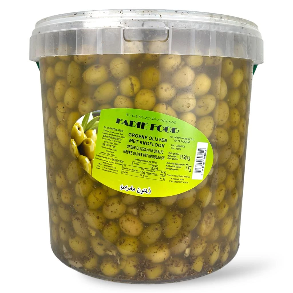 Fadie Food Green Olives with Garlic 11.6kg – Large plastic bucket with 11.6kg of whole green olives infused with garlic. Authentic Mediterranean flavor, preserved in brine. Ideal for mezze, salads, and cooking. Store in a cool, dry place and refrigerate after opening.