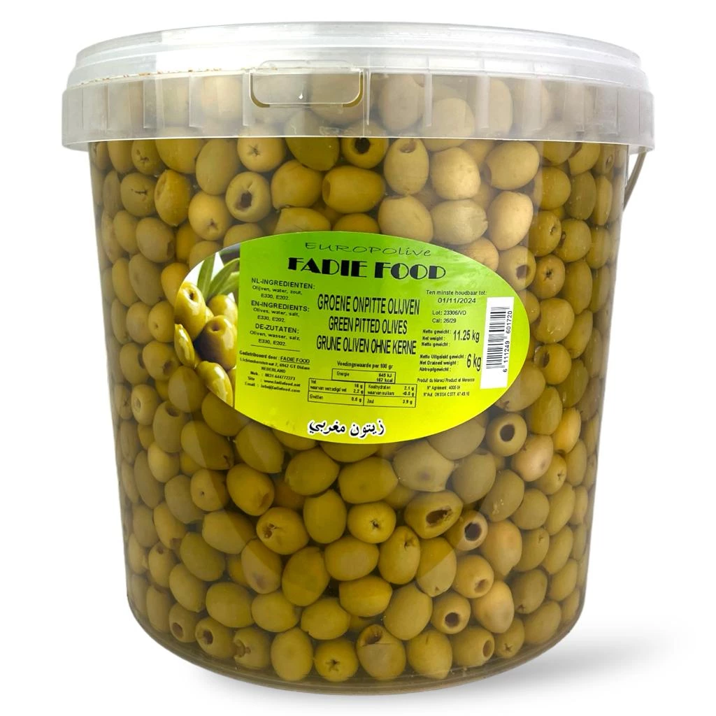 Fadie Food Green Unpitted Olives 11.5kg – Large plastic bucket with 11.5kg of whole green olives with pits. Traditional and full of flavor, preserved in brine for freshness. Ideal for catering, restaurants, and wholesale. Store in a cool, dry place and refrigerate after opening.