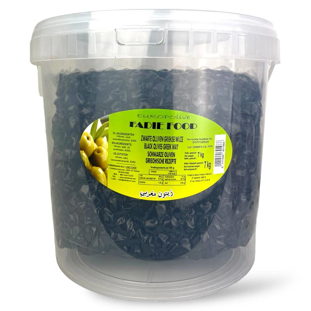 Fadie Food Black Greek Pitted Olives 7kg – Vacuum-sealed 7kg pack of authentic Greek black olives with pits. Traditional flavor preserved in brine. Perfect for mezze, salads, and Mediterranean cooking. Store in a cool, dry place and refrigerate after opening.