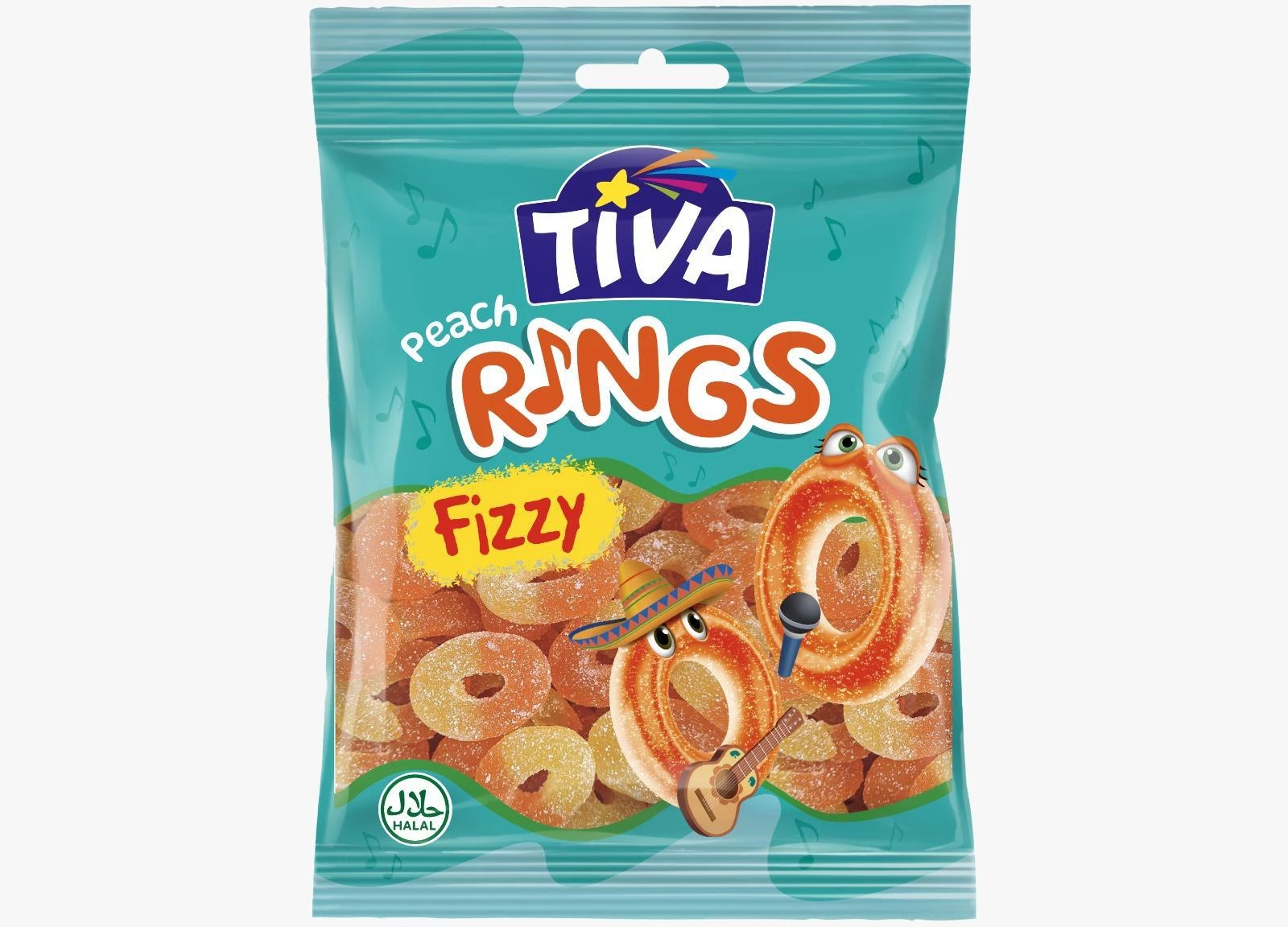 Tiva Fizzy Peach Rings. Soft gummy rings with juicy peach flavor and a fizzy sugar coating for a sweet-and-sour twist, certified Halal. Packed in 80 g bags, perfect for snacking and sharing. Supplied as a case of 6 × 12 × 80 g packs. Store in a cool, dry place; reseal after opening to keep fresh.